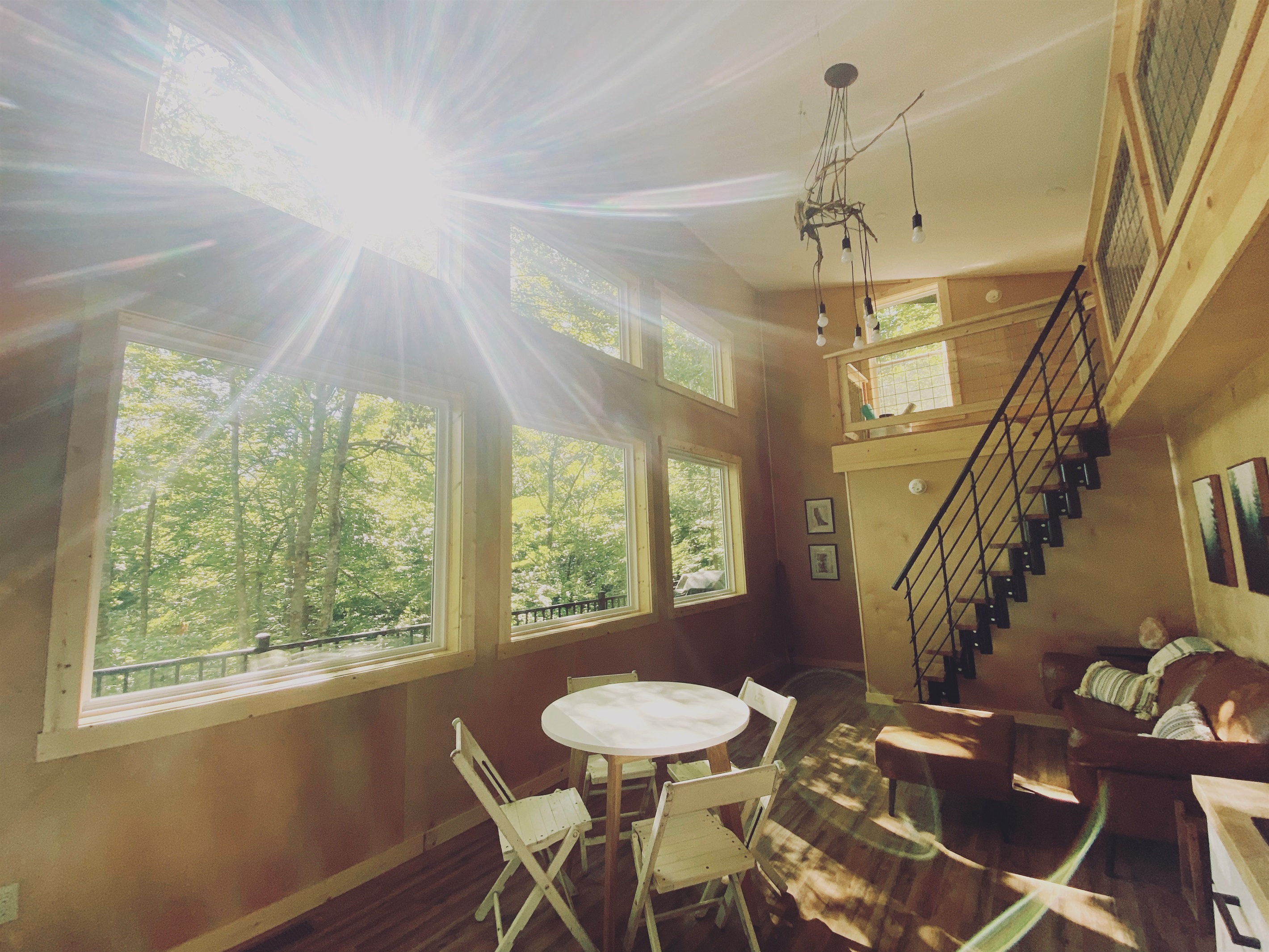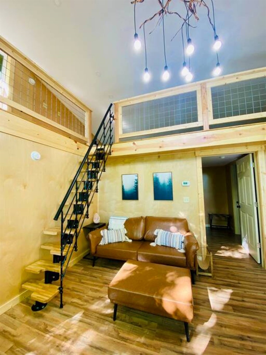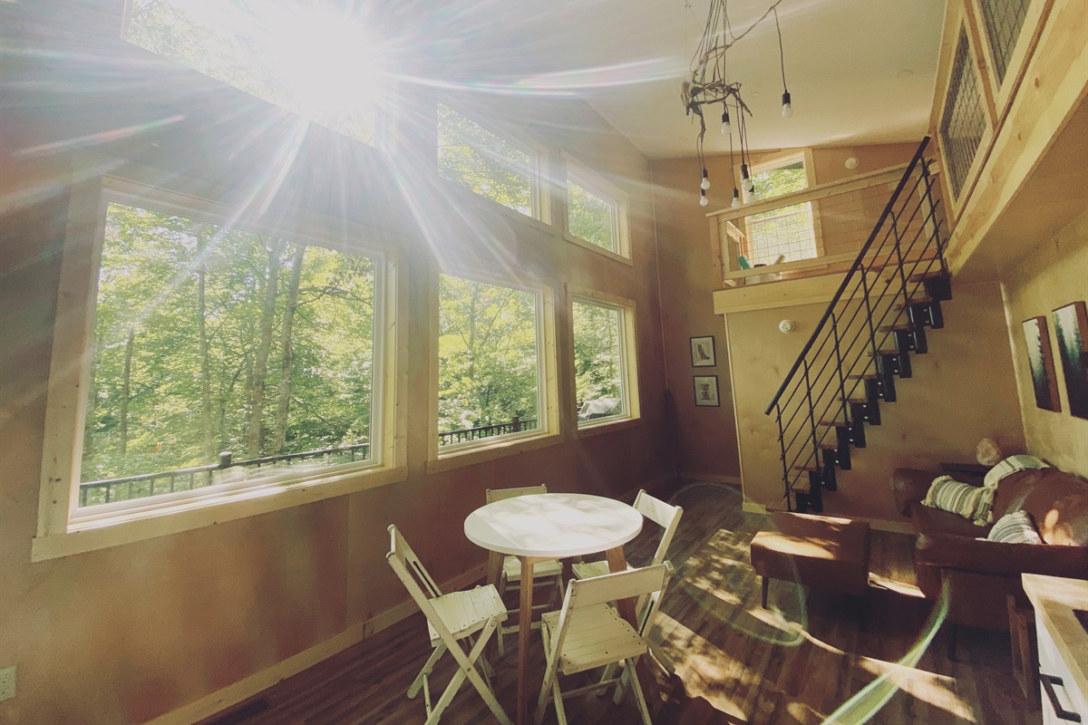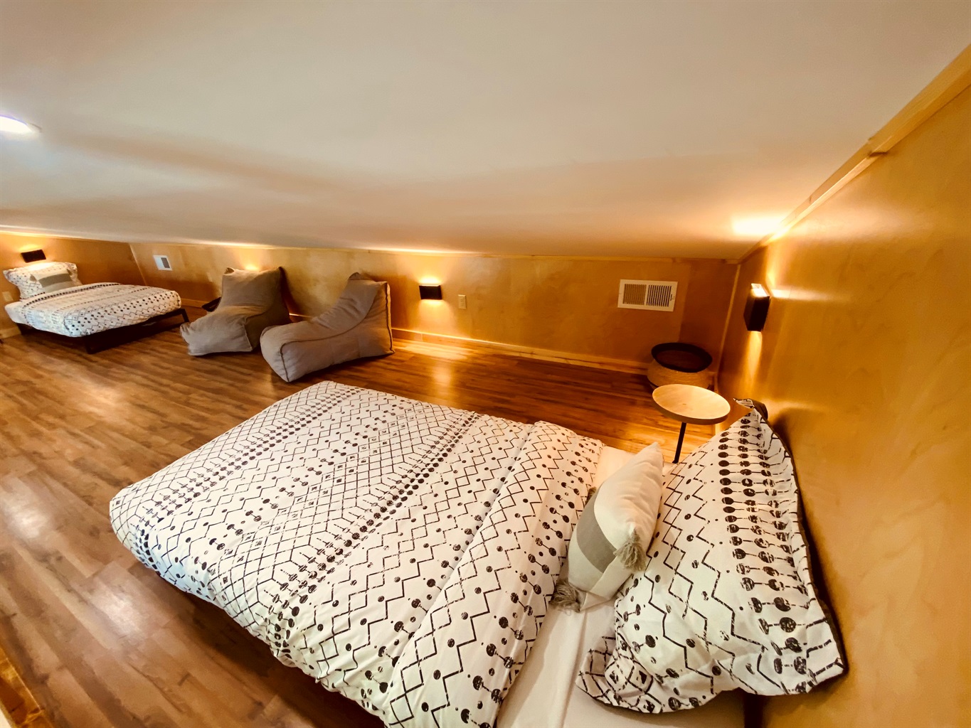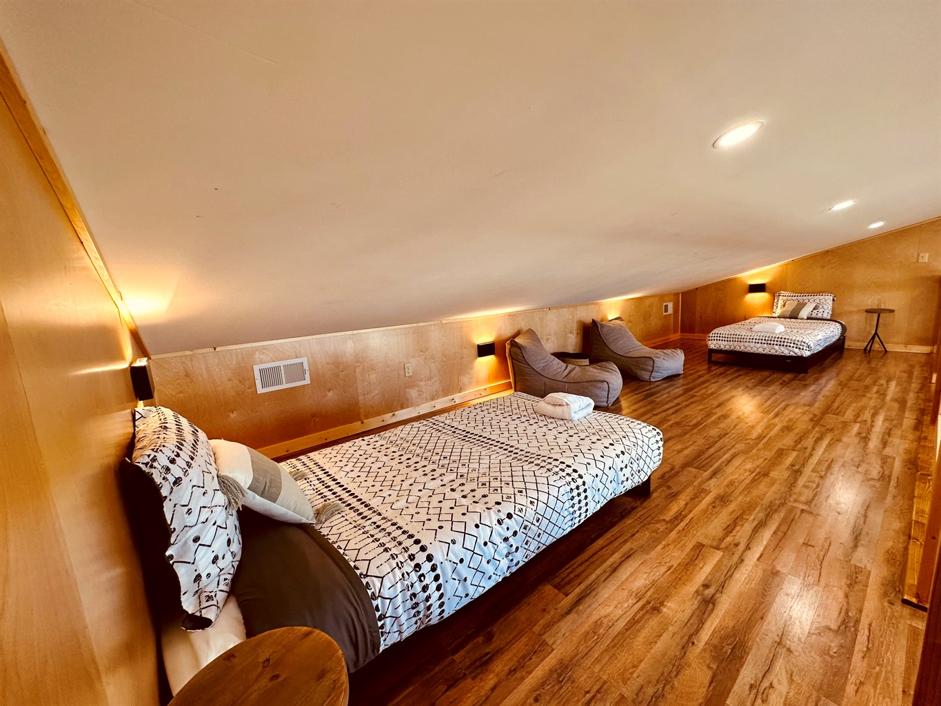 Floating staircase leads to two twin beds, bean bag chairs, and a dedicated yoga deck with mats, blocks, and a foam roller. Sunrise sessions with a ridgeline view are a real option — we suggest taking them.