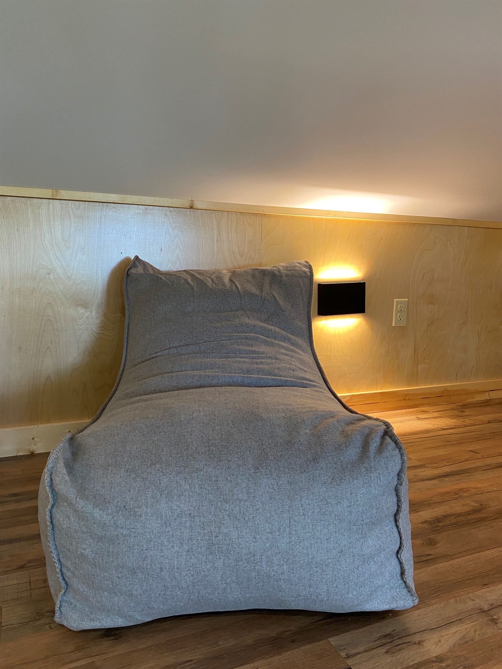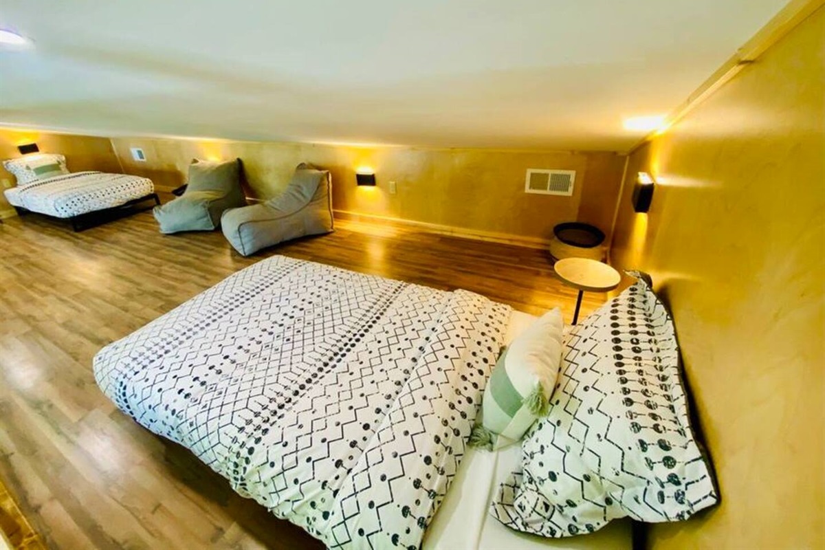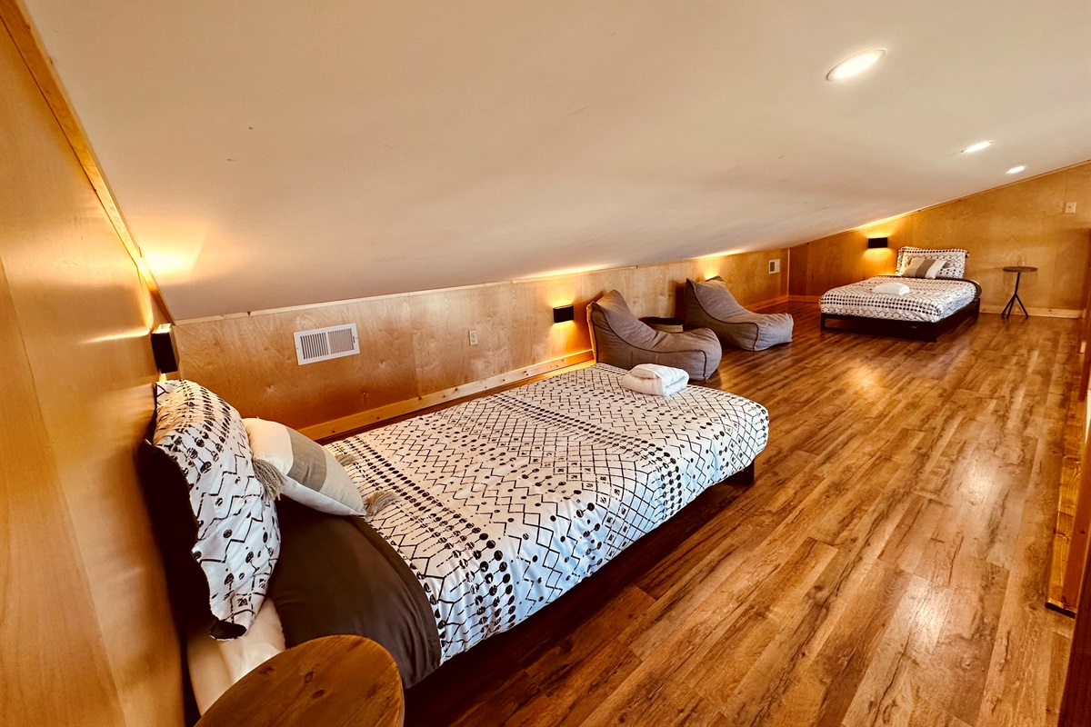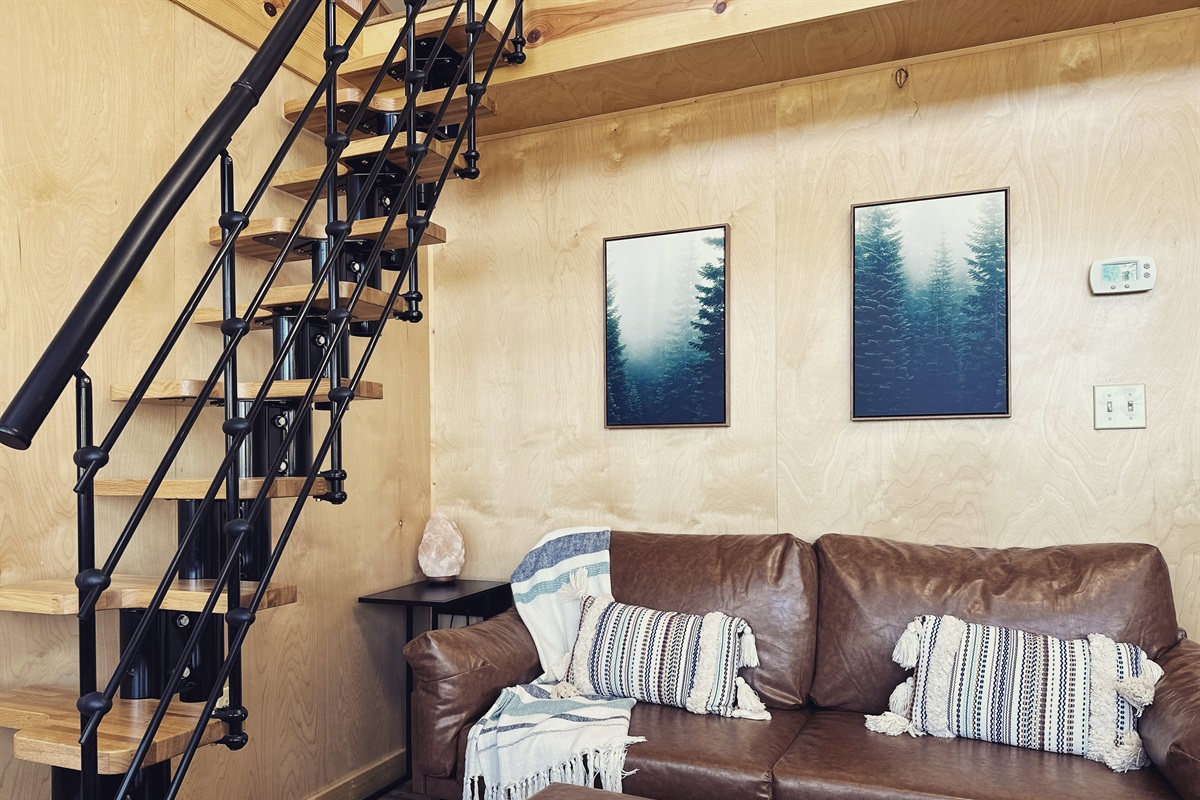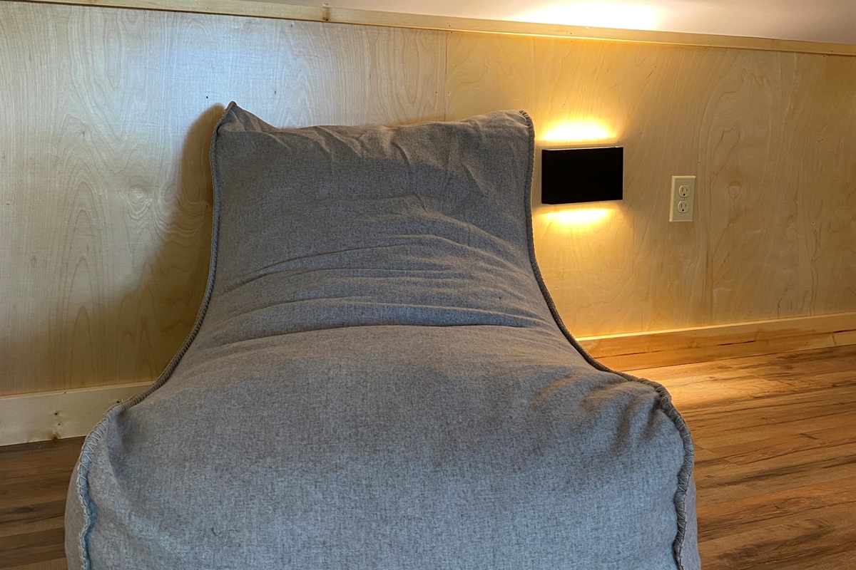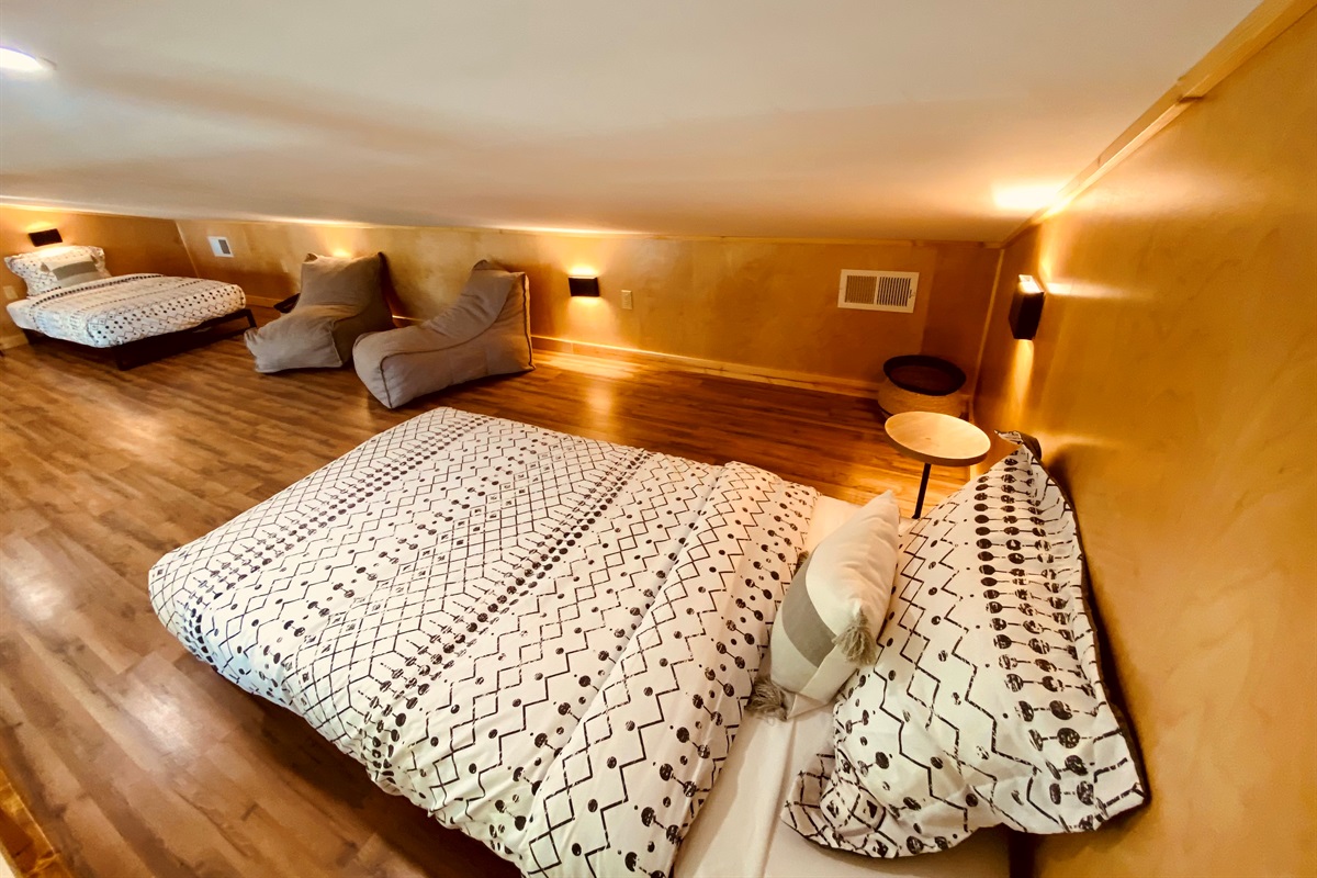 Floating staircase leads to two twin beds, bean bag chairs, and a dedicated yoga deck with mats, blocks, and a foam roller. Sunrise sessions with a ridgeline view are a real option — we suggest taking them.