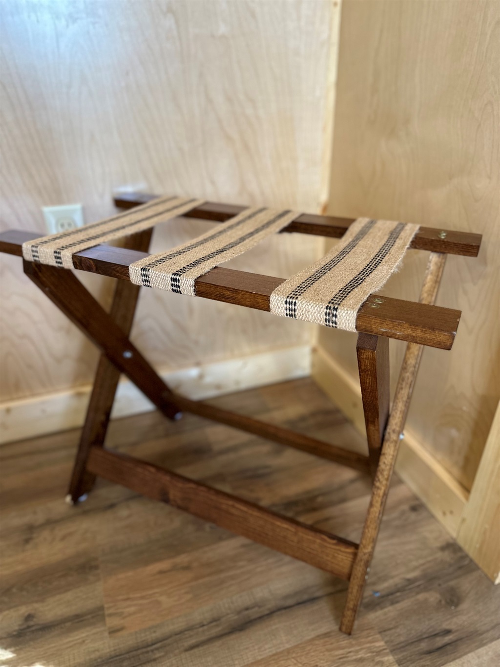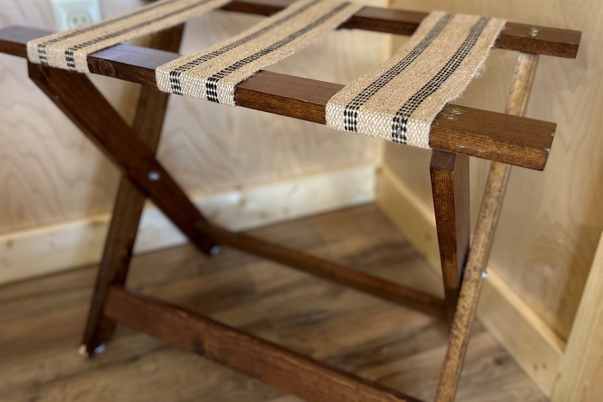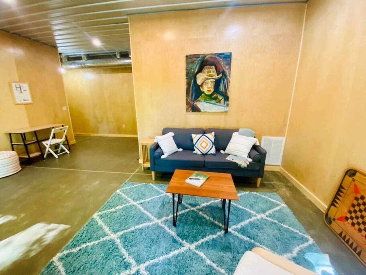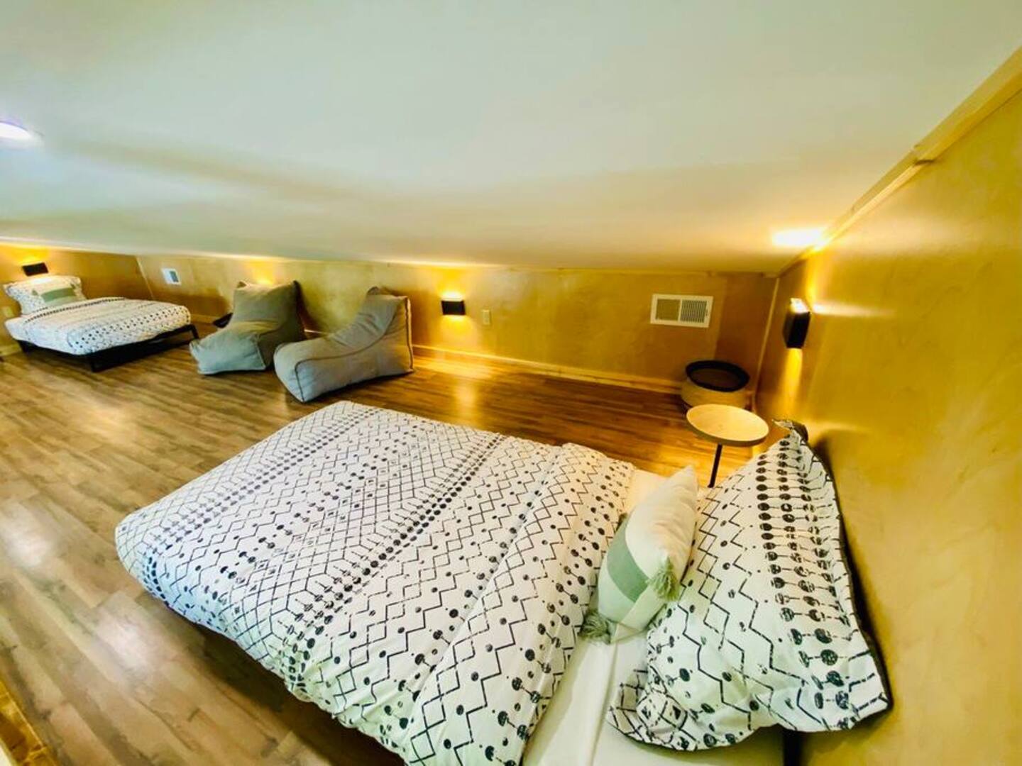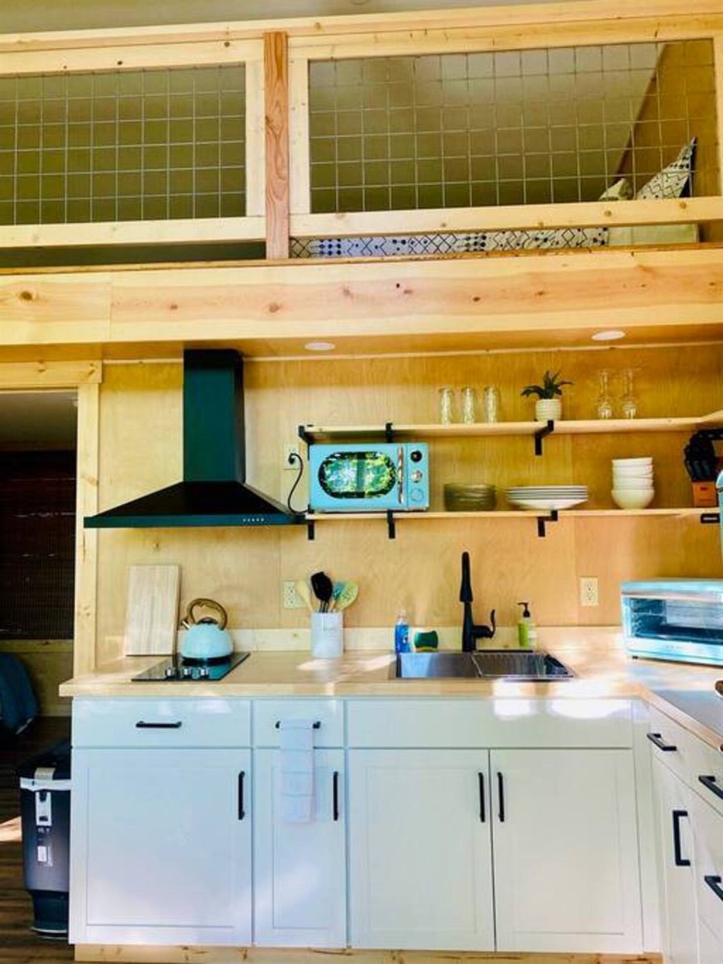 Floating staircase leads to two twin beds, bean bag chairs, and a dedicated yoga deck with mats, blocks, and a foam roller. Sunrise sessions with a ridgeline view are a real option — we suggest taking them.