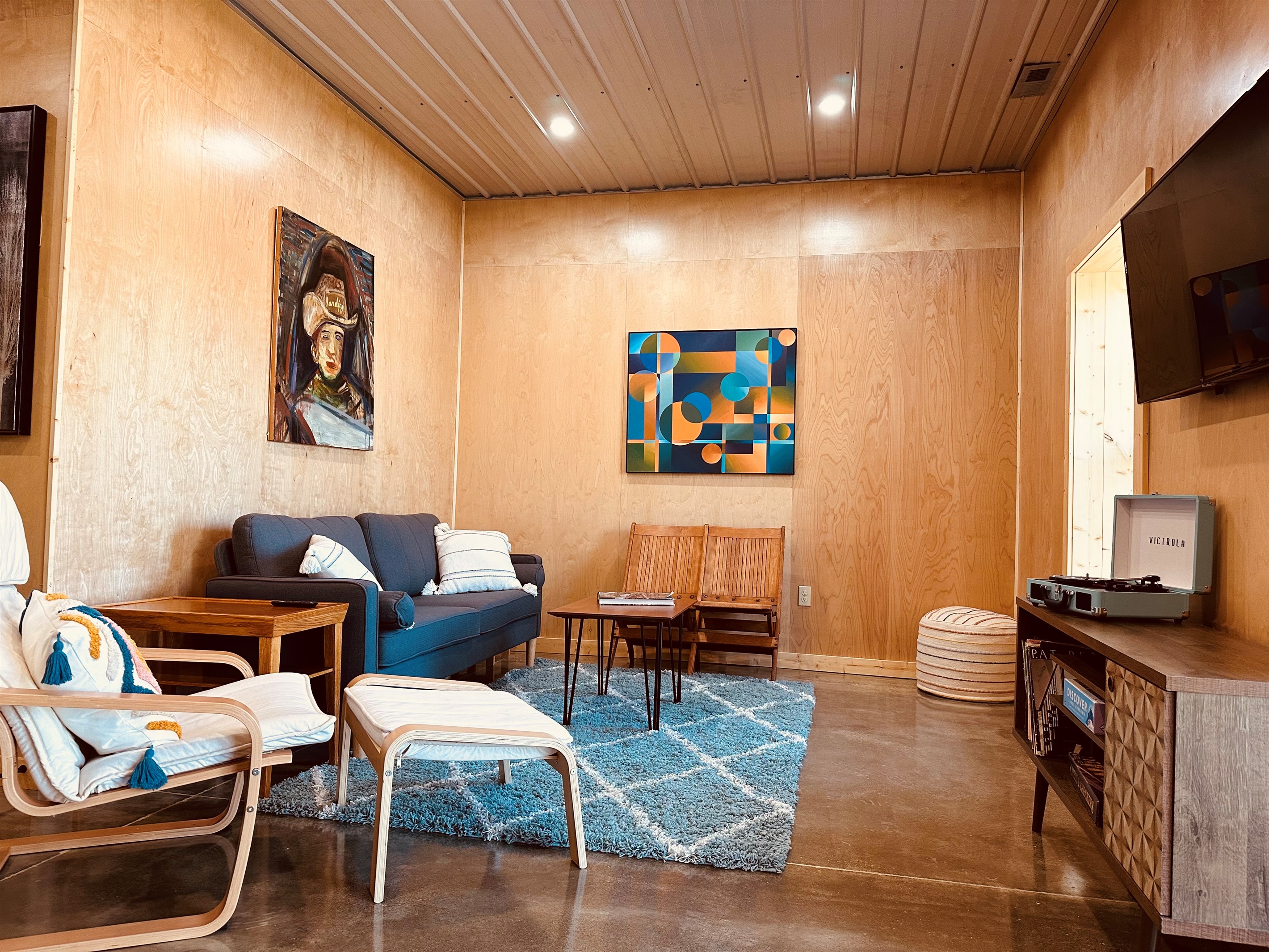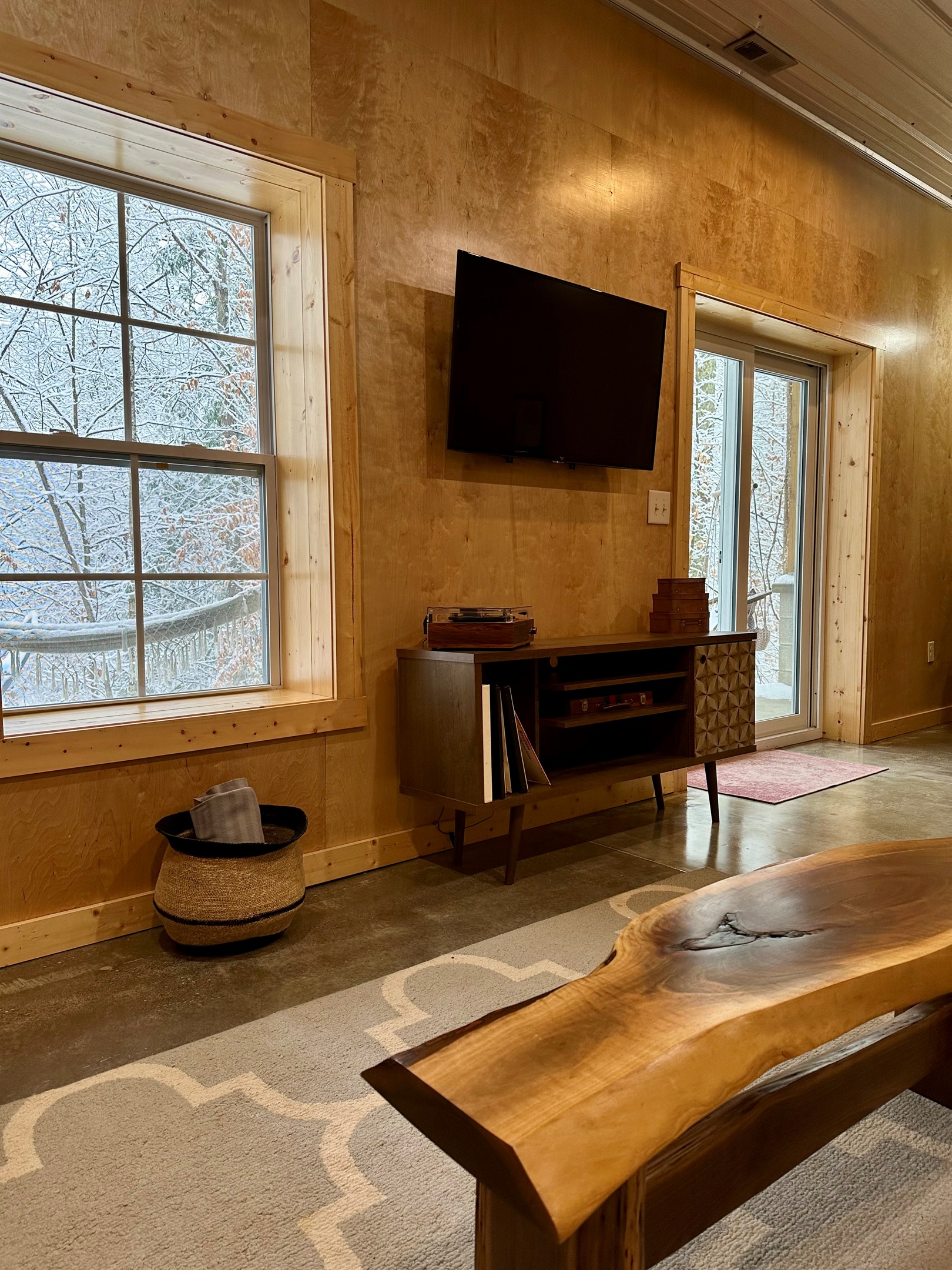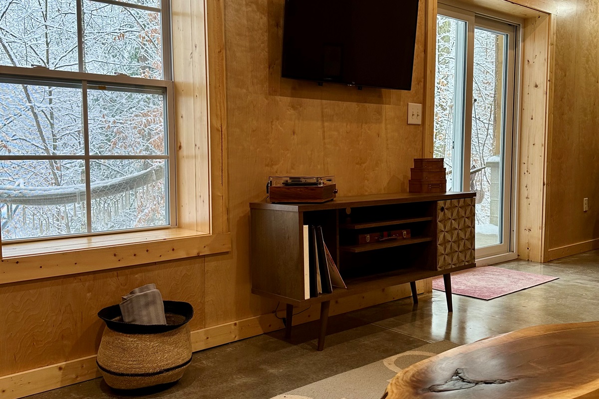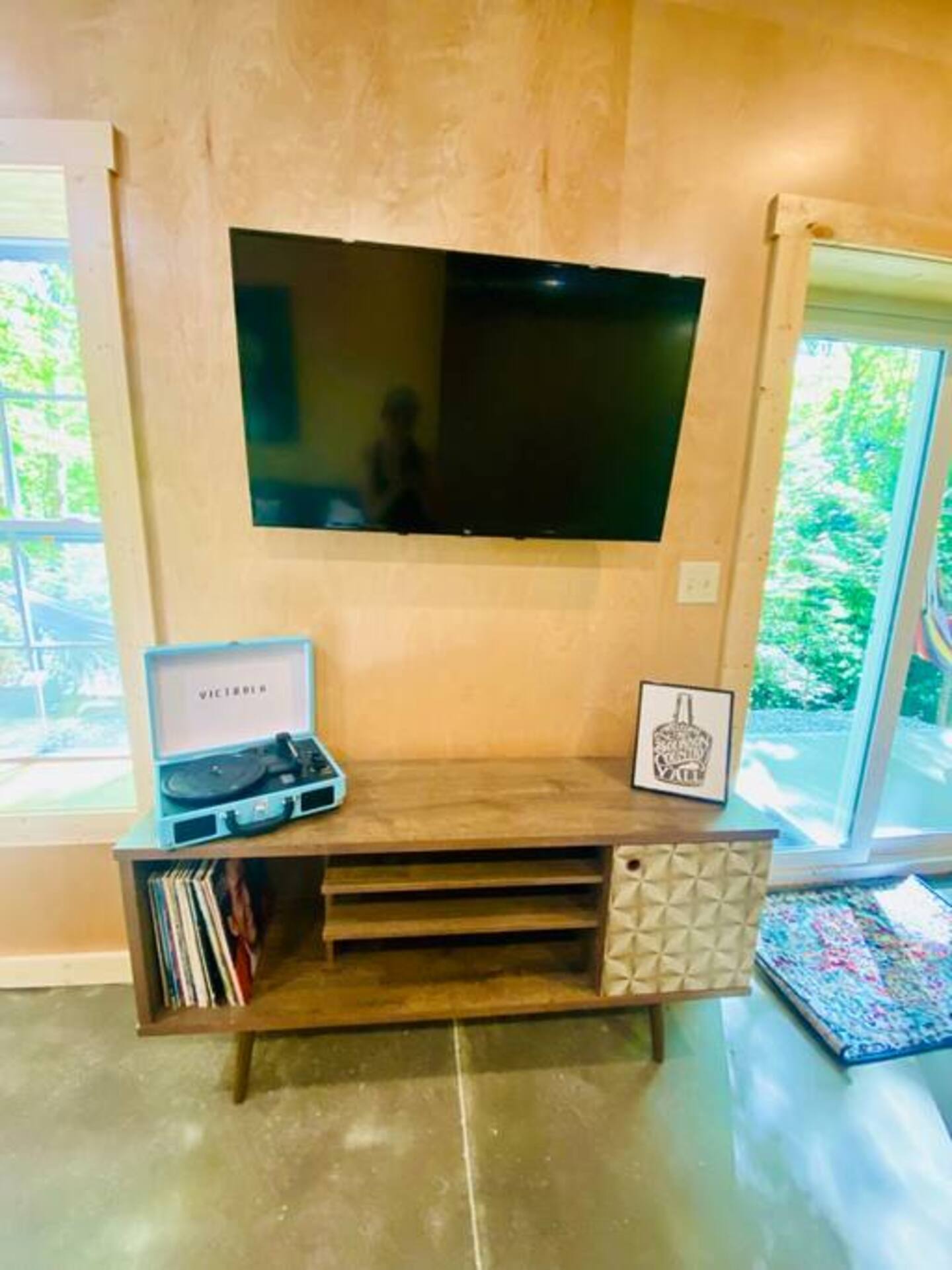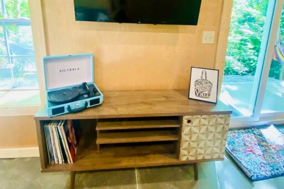 Record player, curated book collection, board games, Amazon Fire TV, half-bath, sliding doors to the hammock zone. Rainy days are handled.