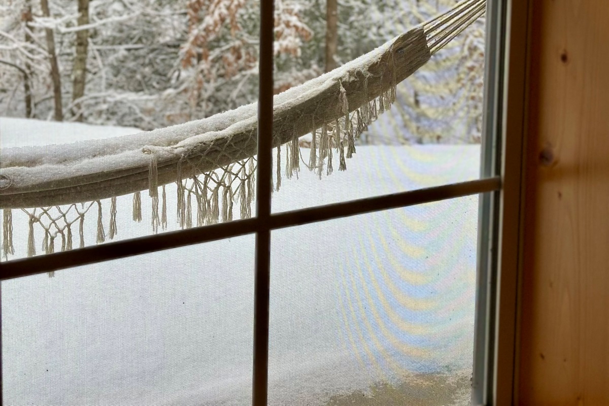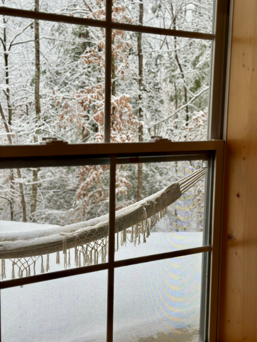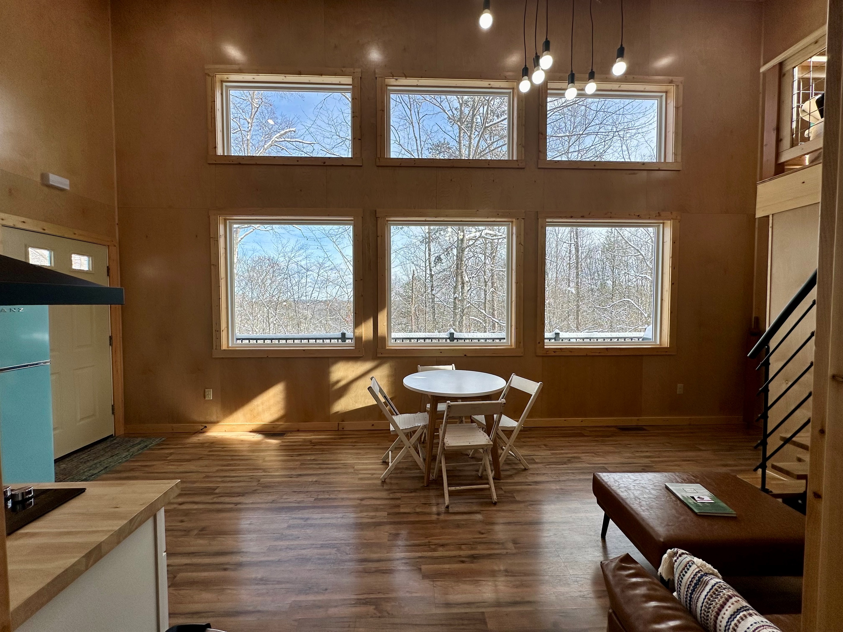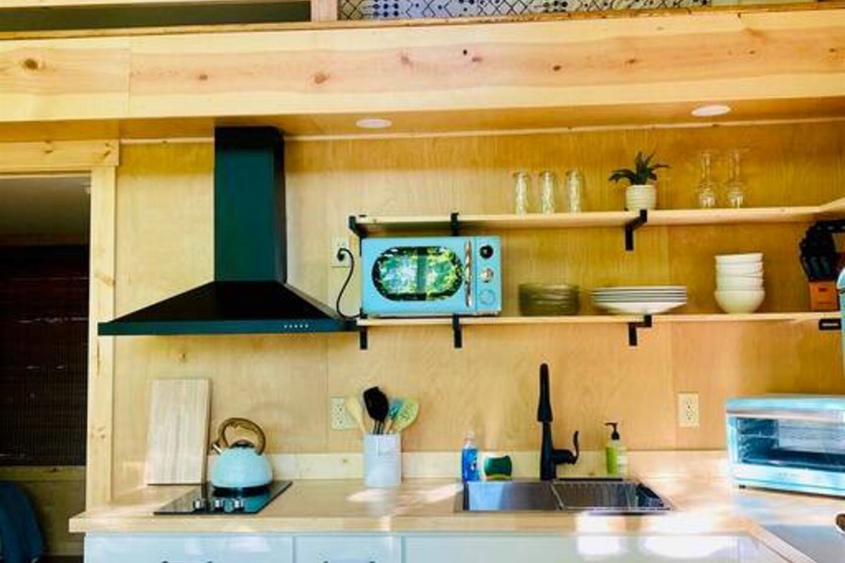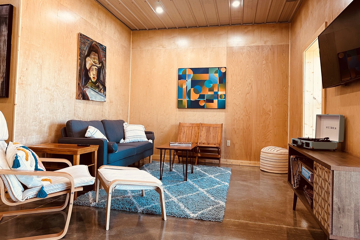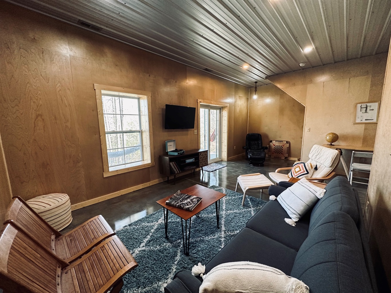 Record player, curated book collection, board games, Amazon Fire TV, half-bath, sliding doors to the hammock zone. Rainy days are handled.