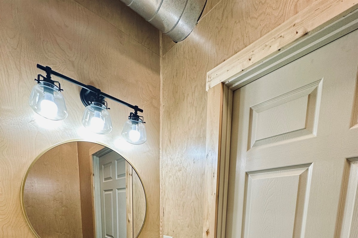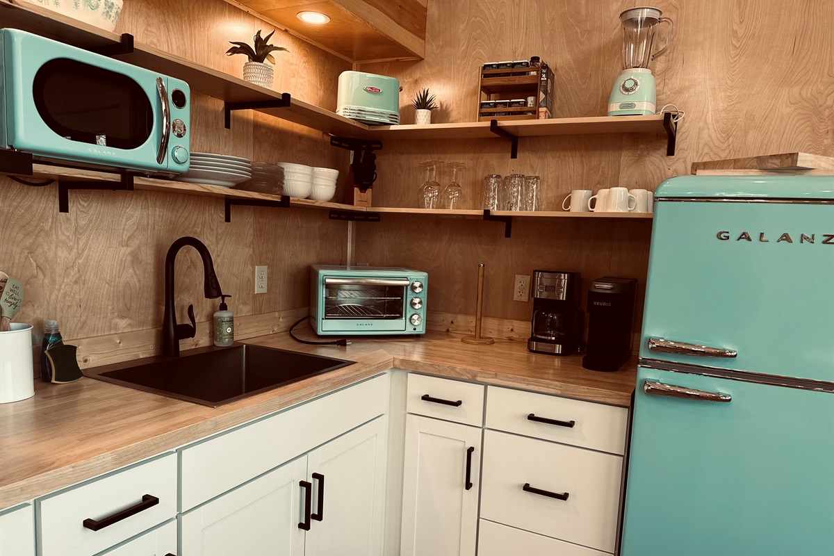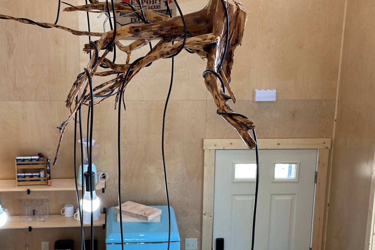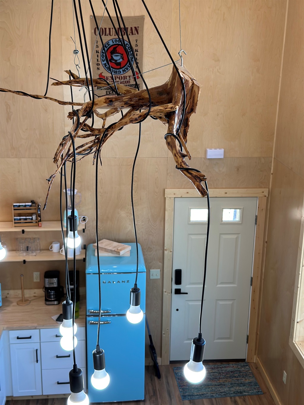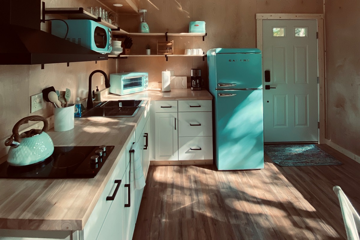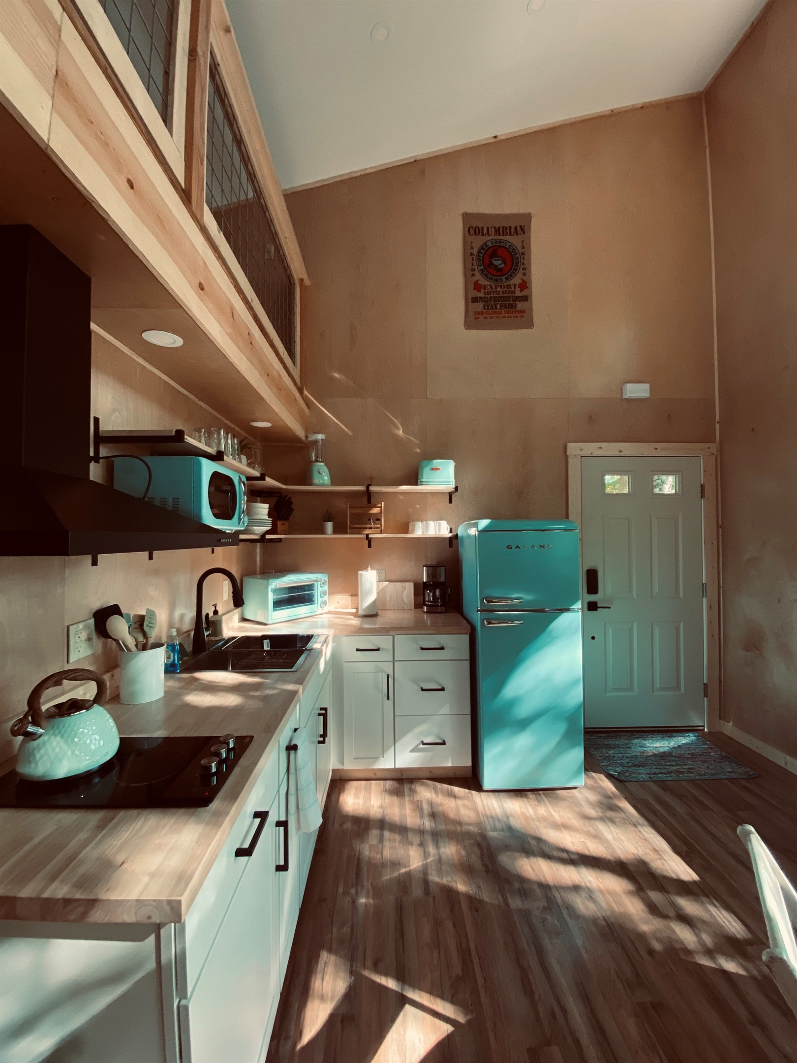Record player, curated book collection, board games, Amazon Fire TV, half-bath, sliding doors to the hammock zone. Rainy days are handled.