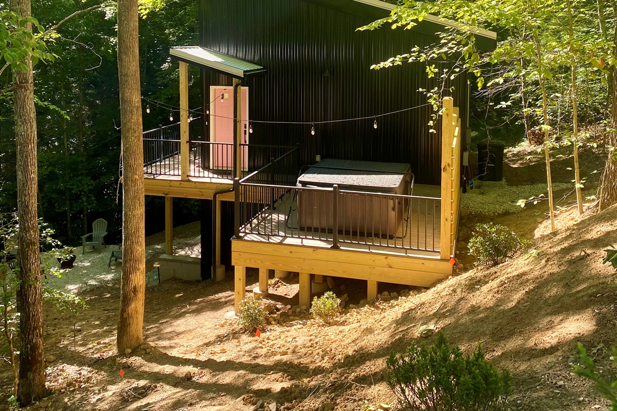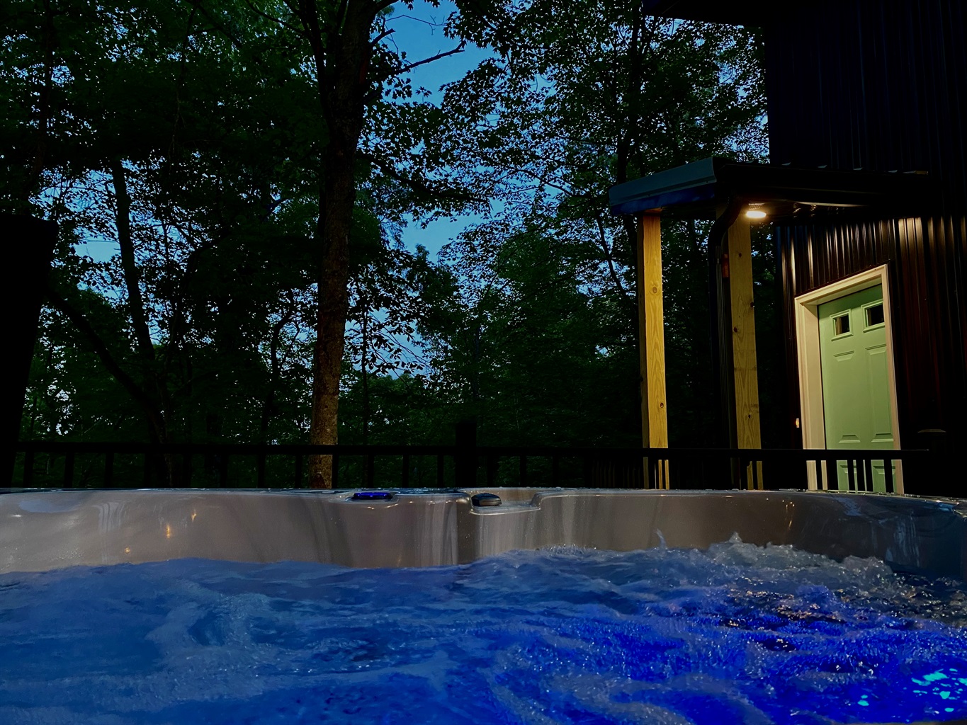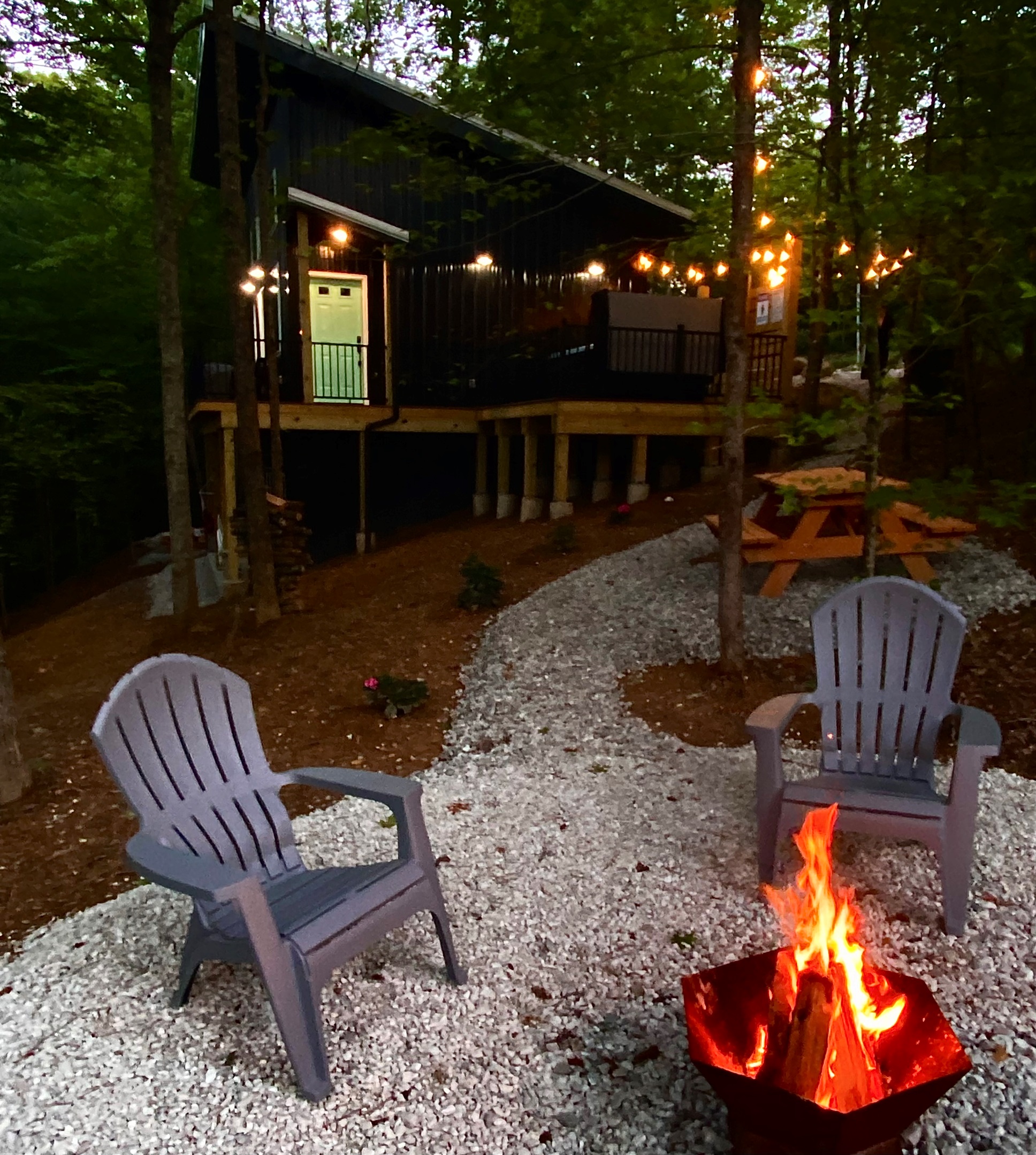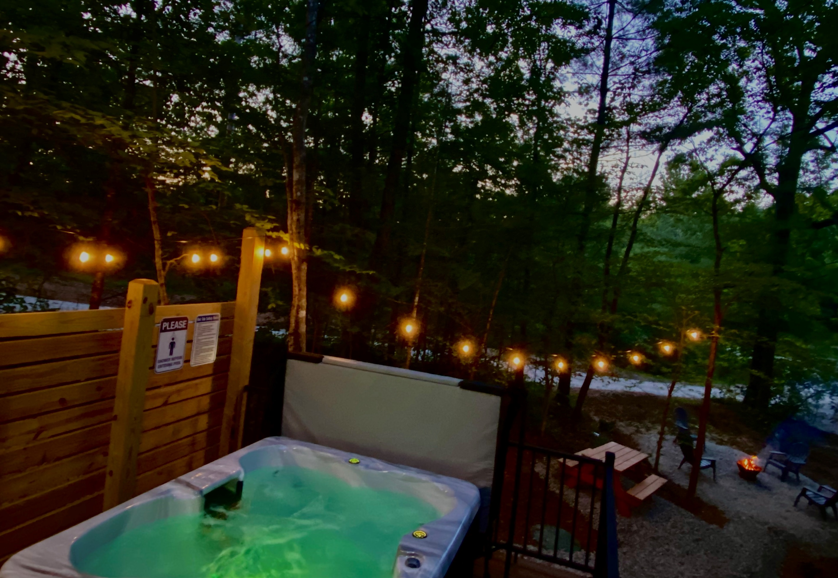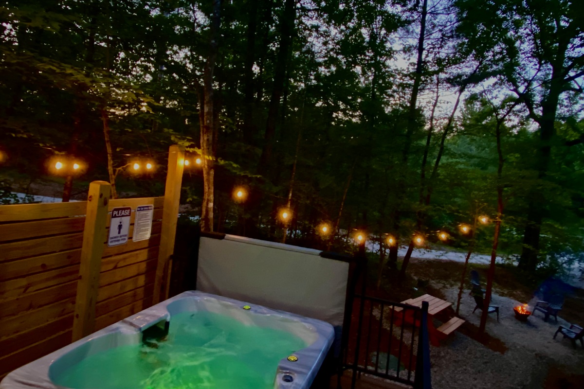 The fire pit is the center of gravity. Two hot tubs — one off each cabin’s deck — mean no waiting and no sharing. Hammocks, outdoor seating, and 140 acres of unfenced hardwood forest round out the rest.