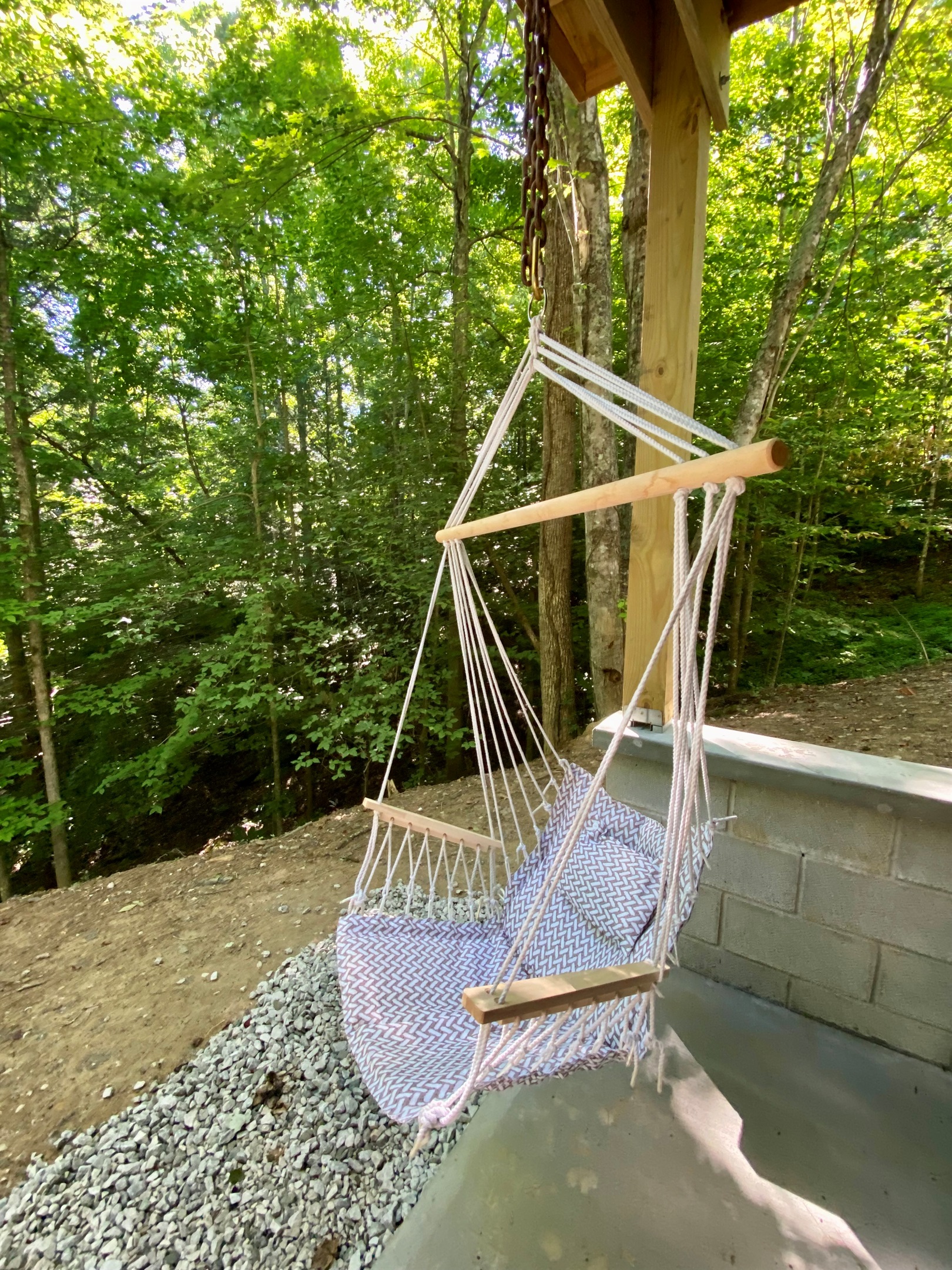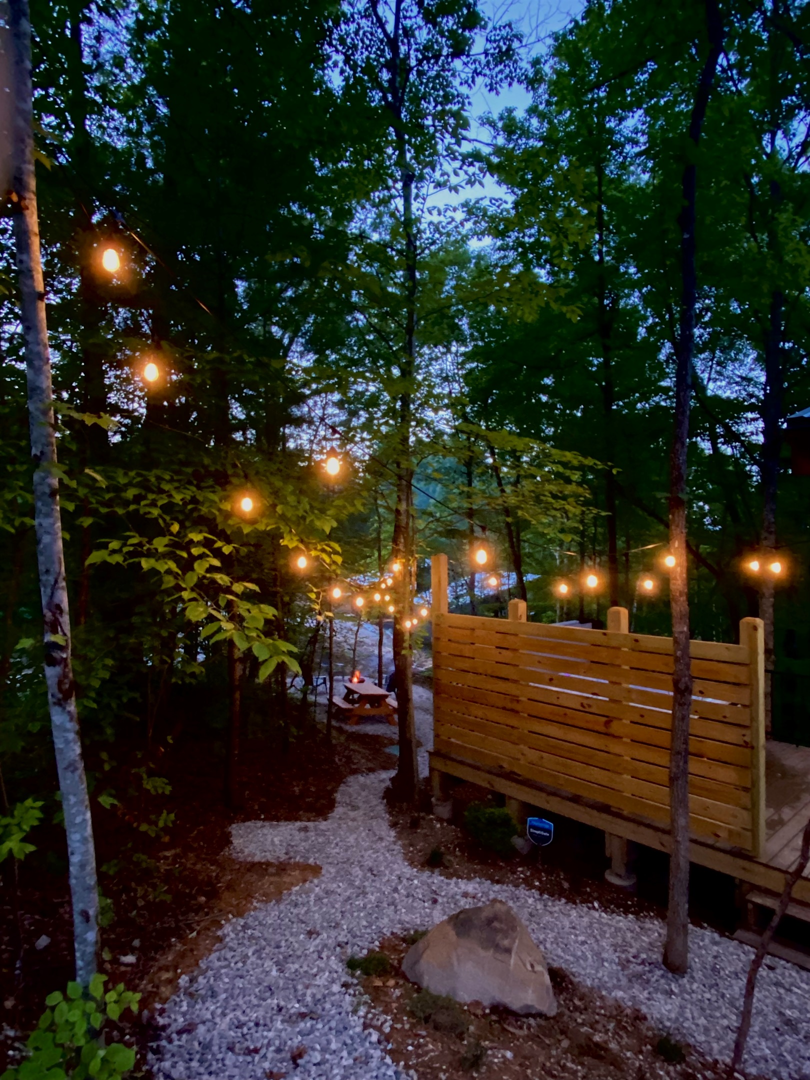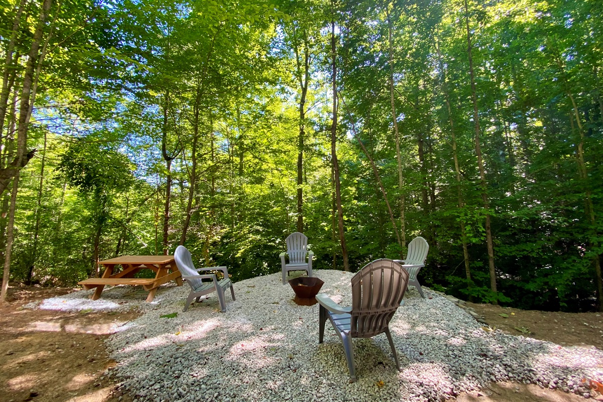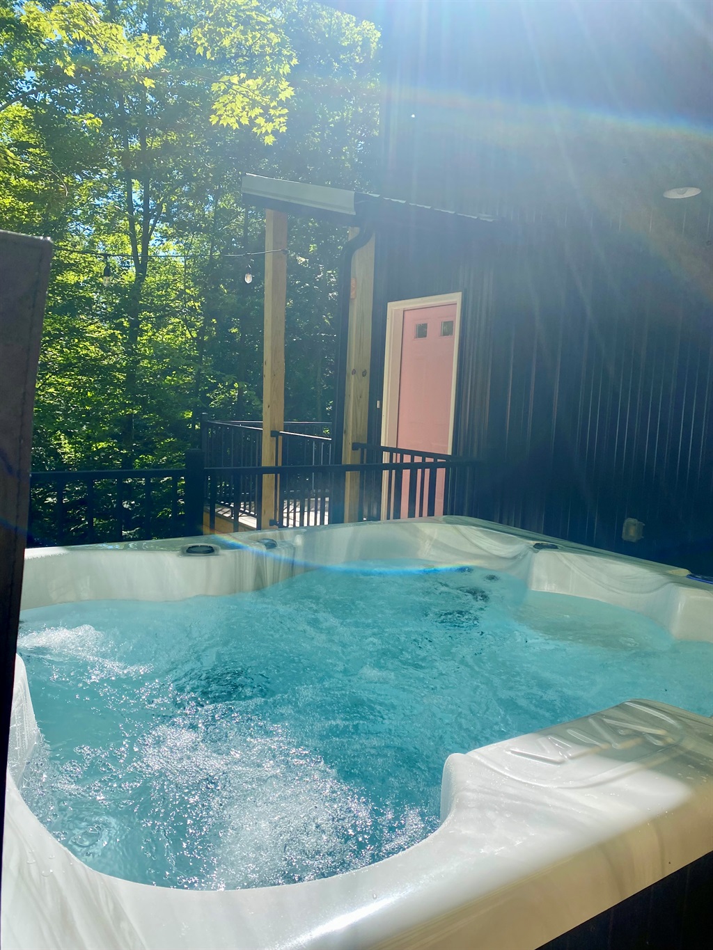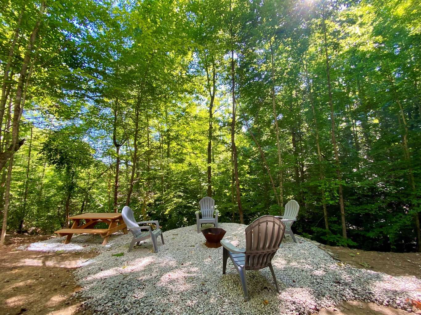 The fire pit is the center of gravity. Two hot tubs — one off each cabin’s deck — mean no waiting and no sharing. Hammocks, outdoor seating, and 140 acres of unfenced hardwood forest round out the rest.