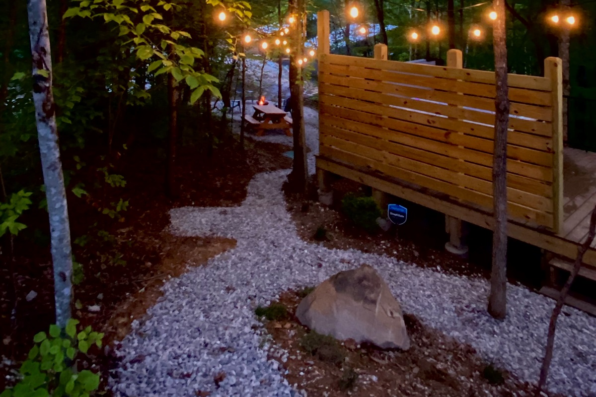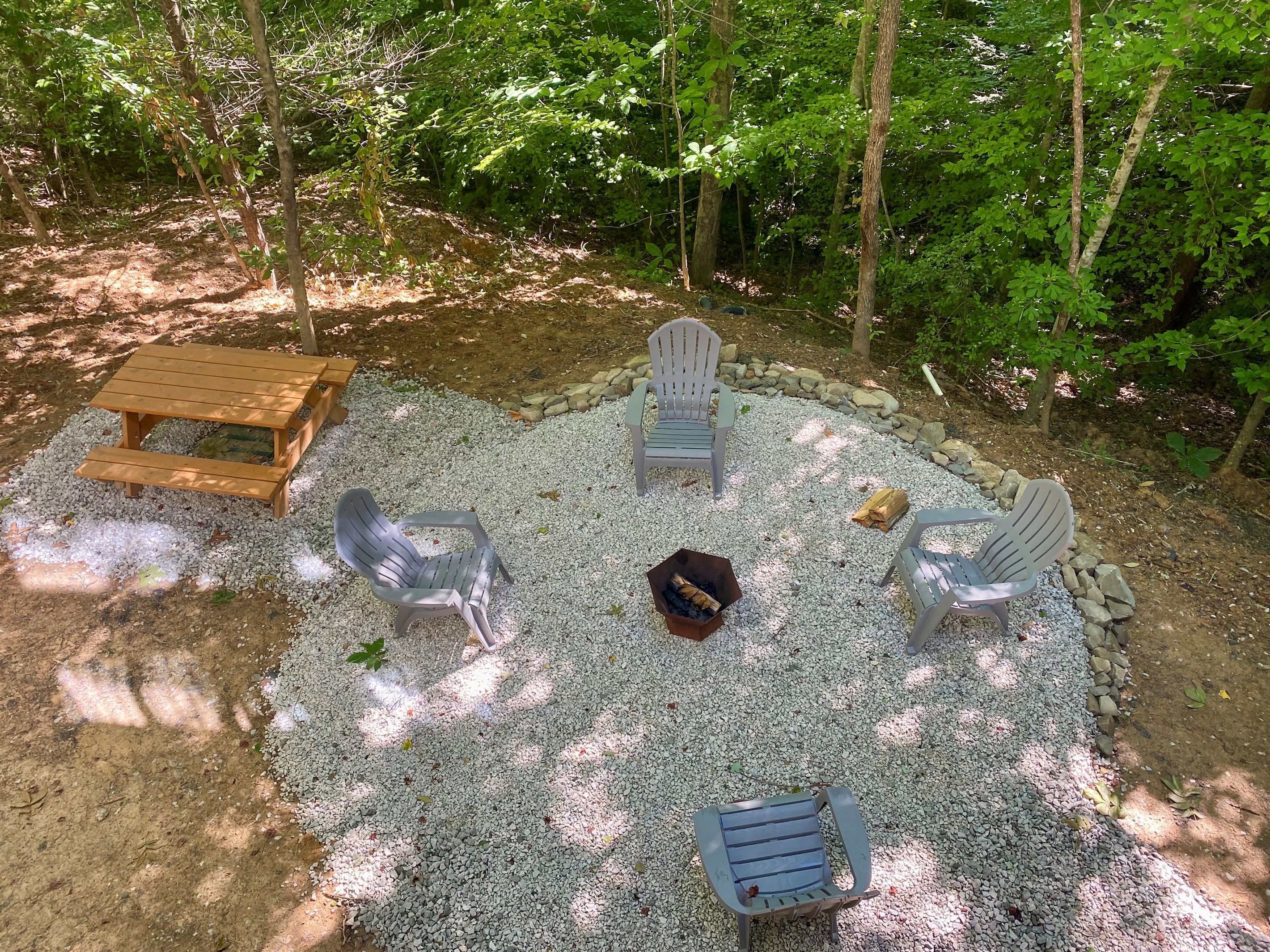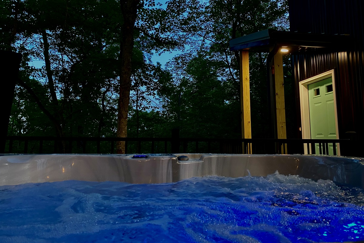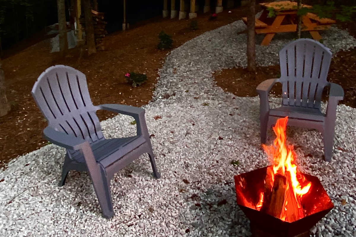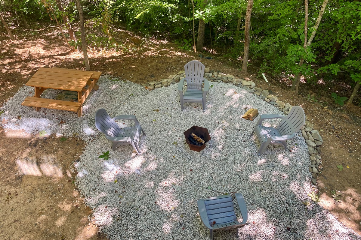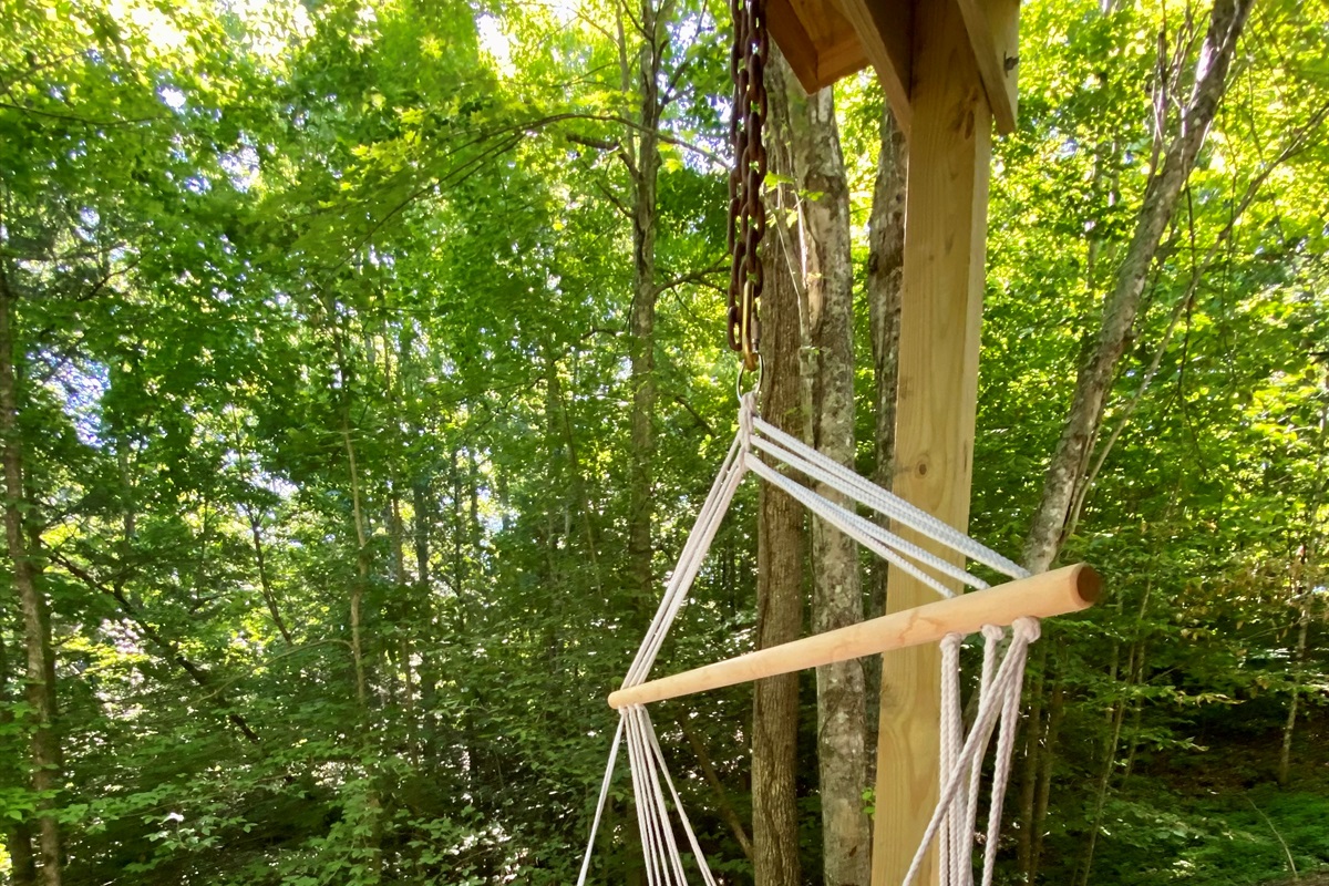 The fire pit is the center of gravity. Two hot tubs — one off each cabin’s deck — mean no waiting and no sharing. Hammocks, outdoor seating, and 140 acres of unfenced hardwood forest round out the rest.